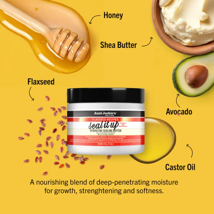 The Protective Styler’s new best friend! Say goodbye to weak, damaged ends and chronically dry hair. Aunt Jackie’s ultimate moisture therapy, Seal It Up, delivers long-lasting hydration, helps prevent split ends, strengthens, and hydrates damaged ends. Flaxseed, rich in Omega fatty acids, together with Honey, Avocado and Shea Butter, helps to prevent shedding and thinning, while softening, shining and protecting hair from breakage. It’s not just for ends! Use Seal It Up to lock in moisture all over hair. Excellent moisture remedy for 3a-4c hair types, protective styling, caring for hair under wigs, weaves and braids, and any hair textures in need of oil-based moisture therapy.